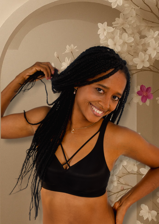 Un bralette delicado y versátil que realza con suavidad y se adapta al cuerpo sin presión. Su escote triangular define el busto de forma natural y las tiras decorativas añaden un toque elegante y sensual. Confeccionado en Nudefit™ Polyamide Blend, ofrece soporte medio, suavidad extrema y total libertad de movimiento. Ideal para una silueta natural y una estética minimalista.